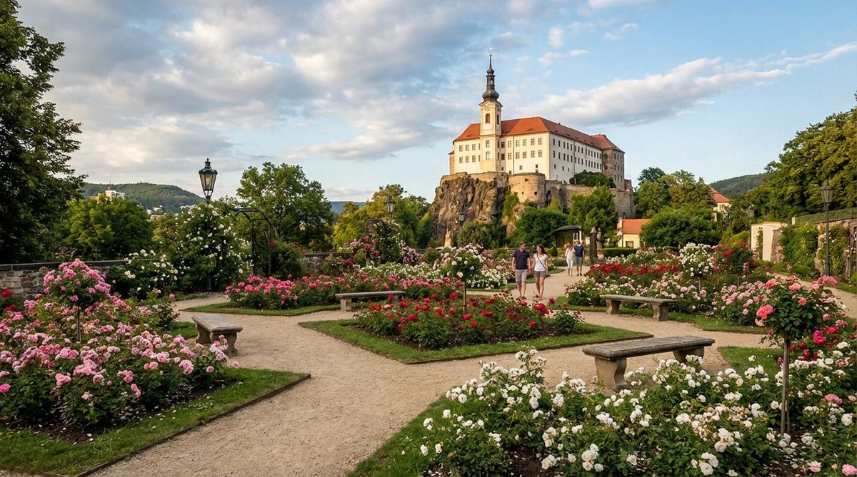 Růžová zahrada v Děčíně nabízí stovky odrůd růží a nádherné výhledy na Labe.